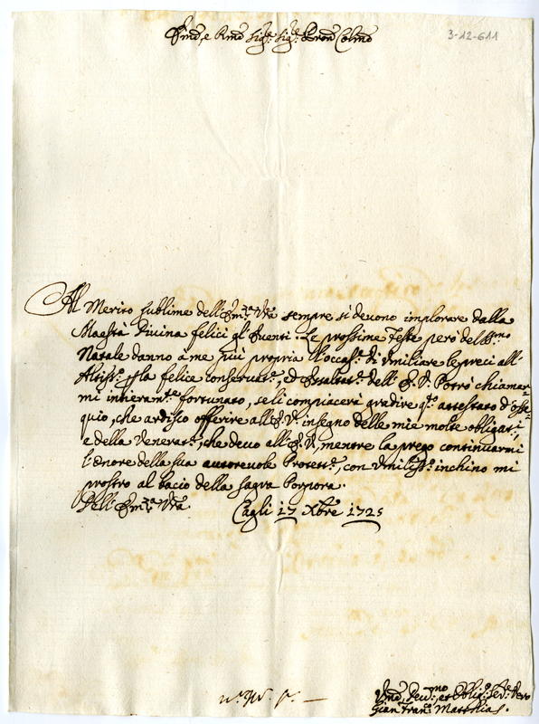 Lettera di Gian Francesco Matthias al cardinale Annibale Albani (1725 dicembre 17)