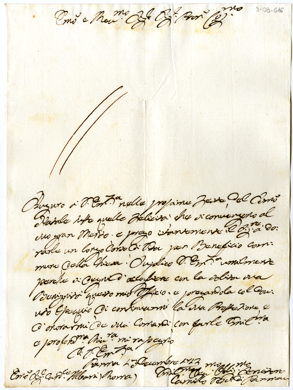 Lettera di Camillo vescovo di Parma al cardinale Annibale Albani (1712 dicembre 23)
