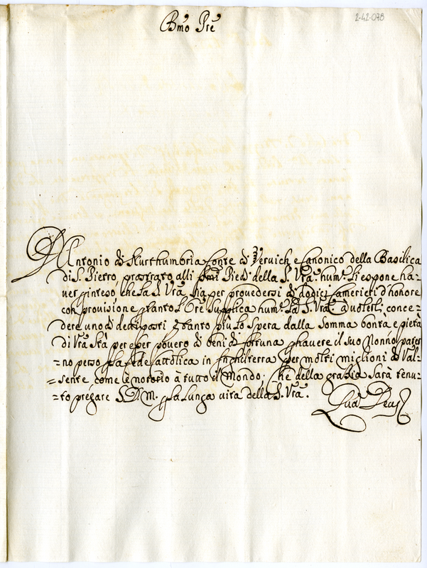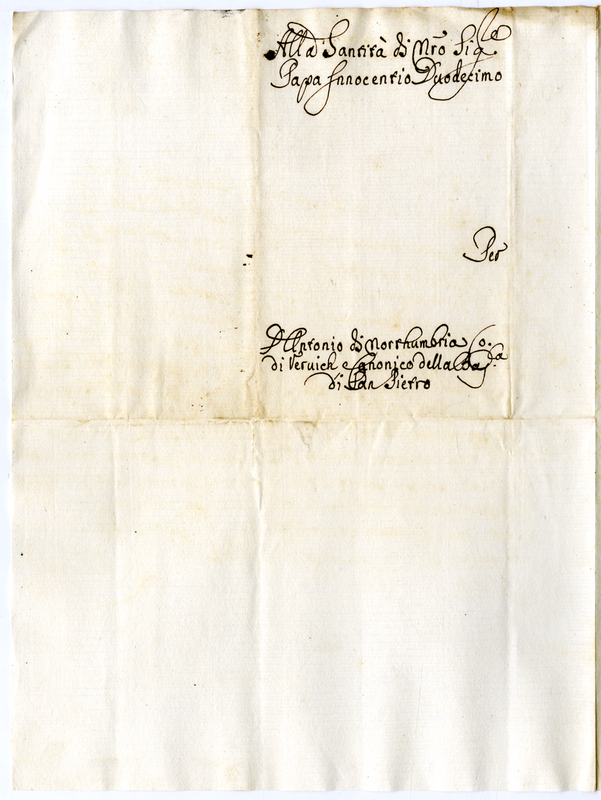 Lettera di padre Antonio di Northumbria Cnte di Vervich canonico di San Pietro a papa Innocenzo XII (1691-1700)