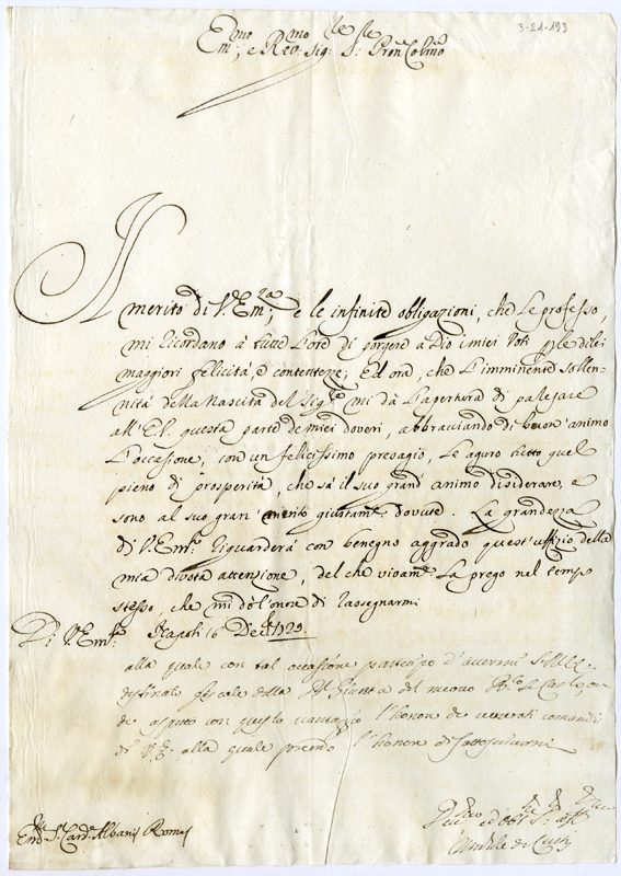 Lettera di Michele de Curtis al cardinale Annibale Albani (1729 dicembre 14)