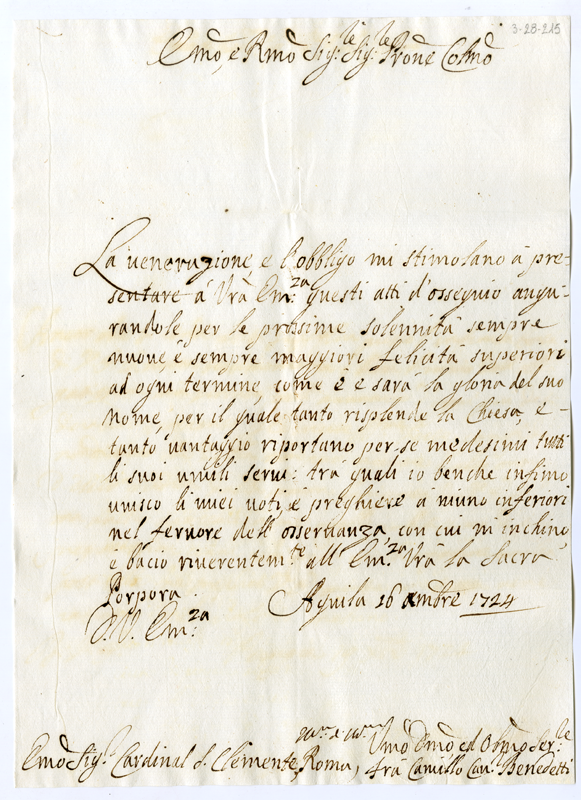 Lettera di fra Camillo Benedetti al cardinale Annibale Albani (1724 dicembre 16)