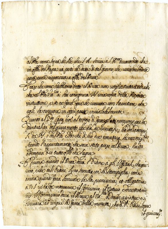 Istruzione data a Mons. Virile per andare a Castel Durante ad altrove a ricevere i giuramenti di fedeltà per la Santa Sede Apostolica vivente ancora il Duca