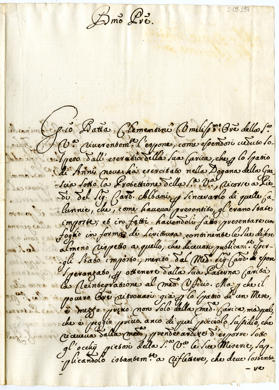 Lettera di Giovanni Battista Clementini a Clemente XI (1700-1721)