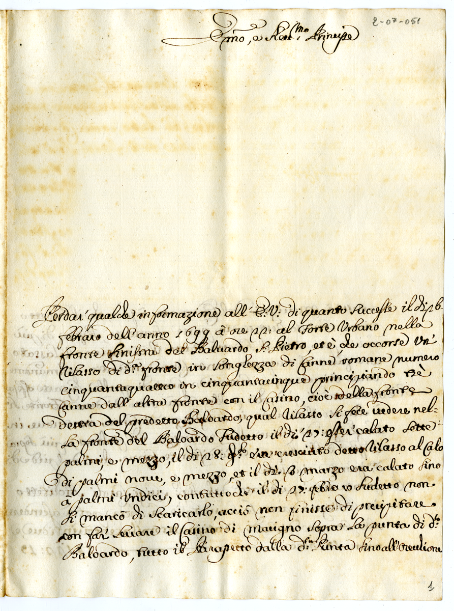 4. Relazione sui danni subiti da Forte Urbano il 26 febbraio 1699 con relativa nota di spesa per i restauri