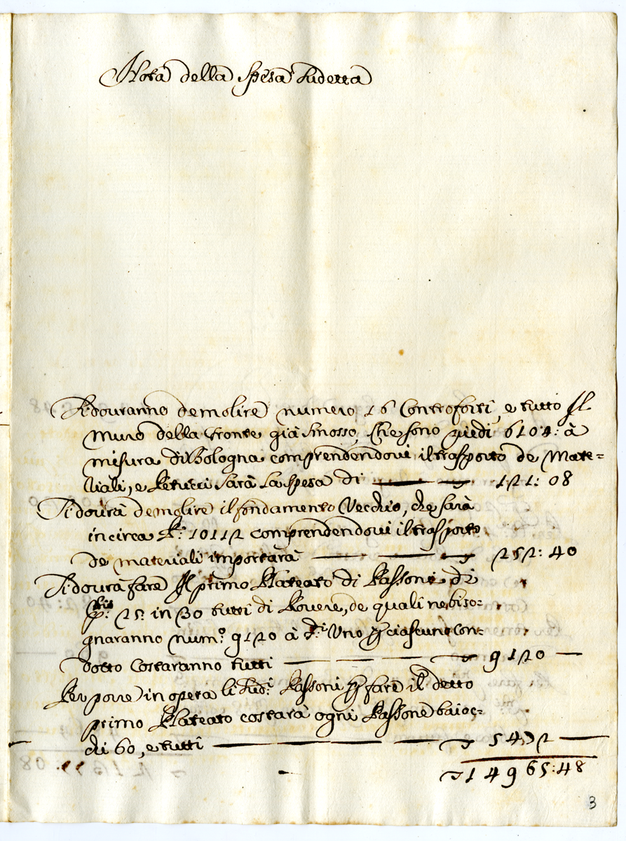 Relazione sui danni subiti da Forte Urbano il 26 febbraio 1699 con relativa nota di spesa per i restauri