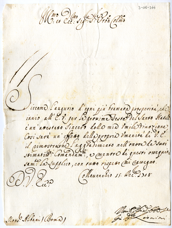 Lettera di Giovanni Francesco Leonini ad Annibale Albani (1708 dicembre 15)