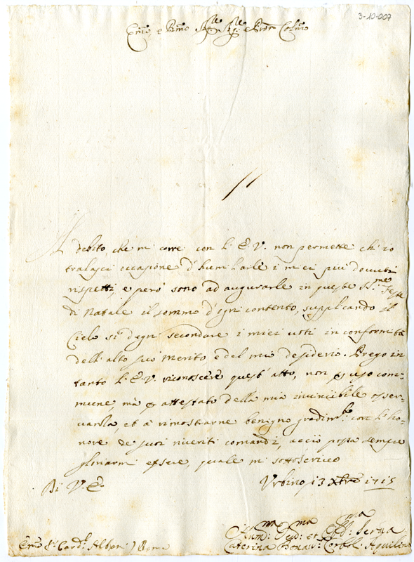 Lettera di Caterina Bonaventura Corboli Aquilini al cardinale Annibale Albani (1715 dicembre 13)