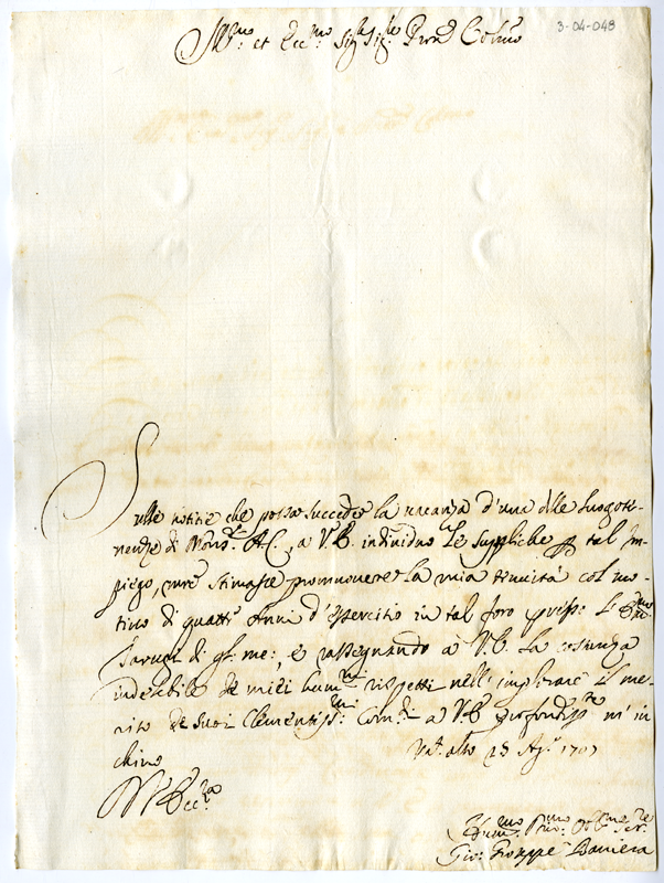 Lettera di Giovanni Giuseppe Baviera ad Annibale Albani (1707 Agosto 25)