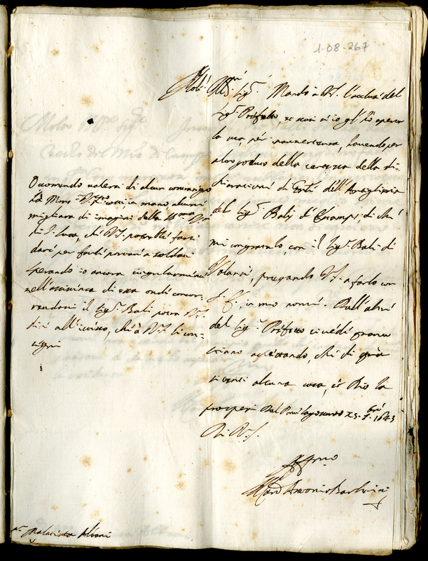 Lettera del cardinale Barberini Antonio senior a Malatesta Albani (1643 settembre 15)