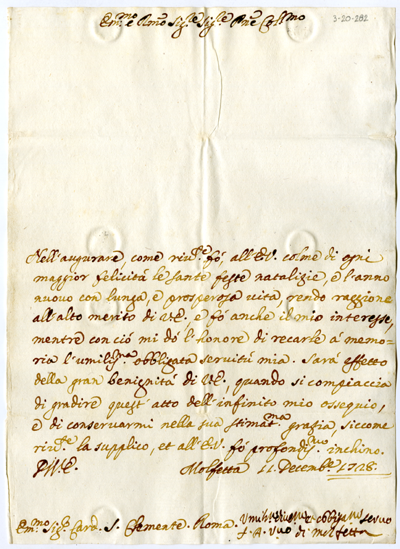 Lettera di Fabrizio vescovo di Molfetta al cardinale Annibale Albani (1728 dicembre 11)