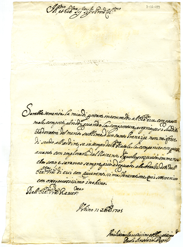 Lettera di Paolo Antonio Vergili ad Annibale Albani (1705 dicembre 12)