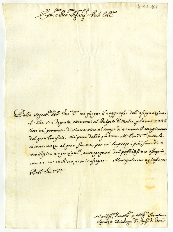 Ringrazia il cardinale di avergli ottenuto il pulpito di Malta