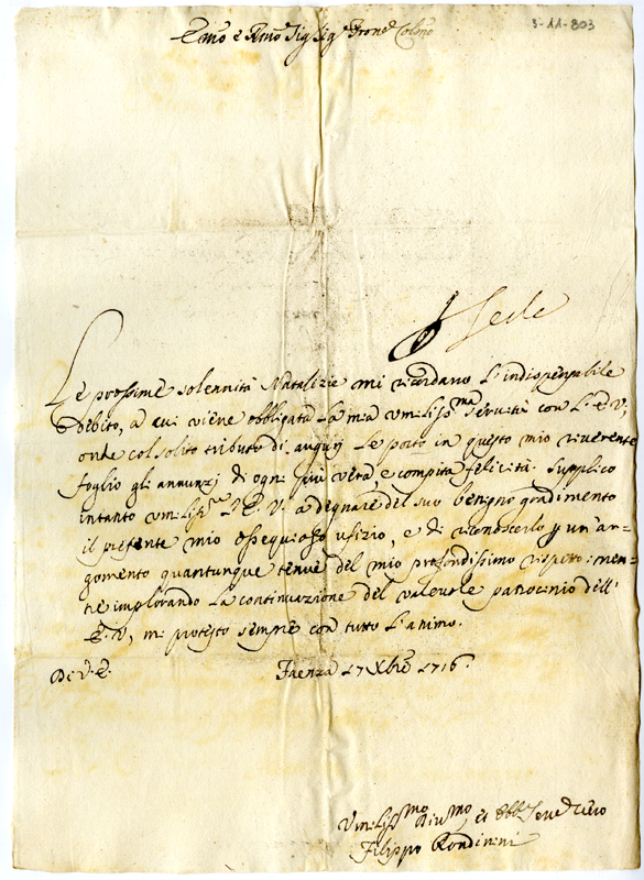 Lettera di Filippo Rondinini al cardinale Annibale Albani (1716 dicembre 17)