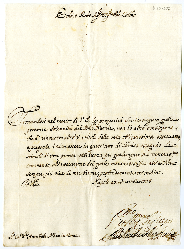 Lettera di Nicola Petra duca di Vastogirardi al cardinale Annibale Albani (1728 dicembre 17)