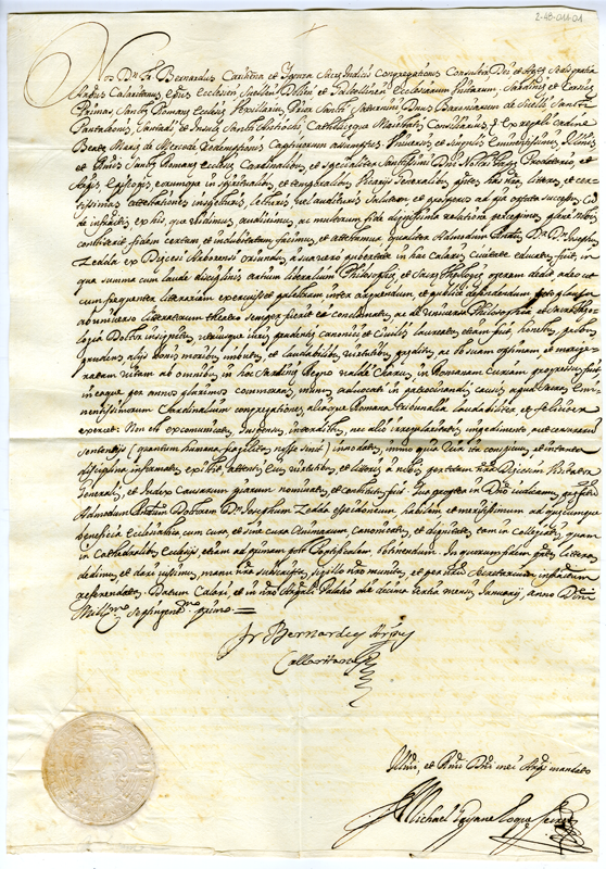 Attestato di Bernardo Carinena arcivescovo di Cagliari in favore di Giuseppe Zedda (1701 gennaio 13