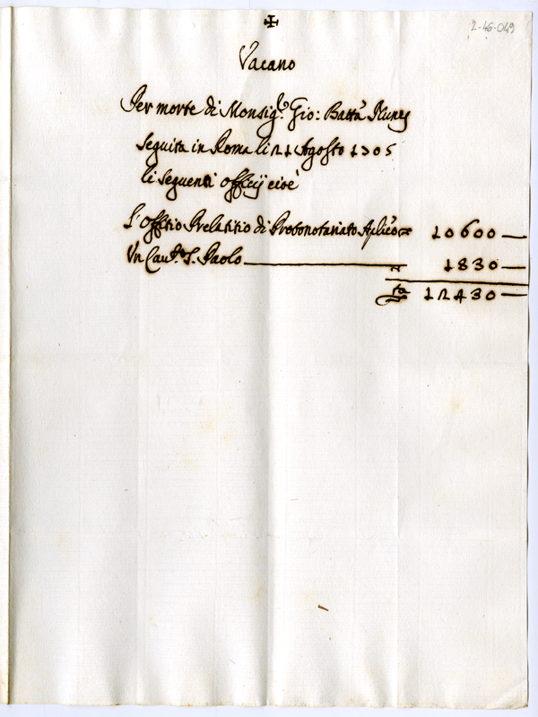 Canonicato vacante per morte di monsignor Giovanni Battista Nunj (1705 agosto 21)