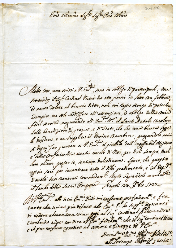 Lettera di Lorenzo Thomas Costa al cardinale Annibale Albani (1727 dicembre 23)