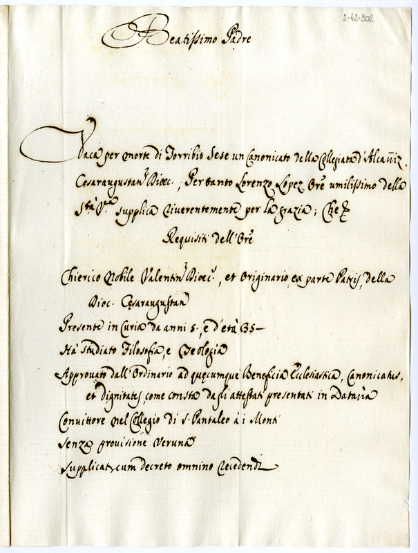 Lettera di Lorenzo Lopez nobile originario di Cesaraugustana presente in Curia da anni 5 a papa Clemente XI (1700-1721)