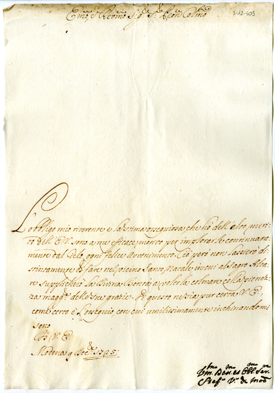 Lettera di Stefano vescovo di Modena al cardinale Annibale Albani (1725 dicembre 9)