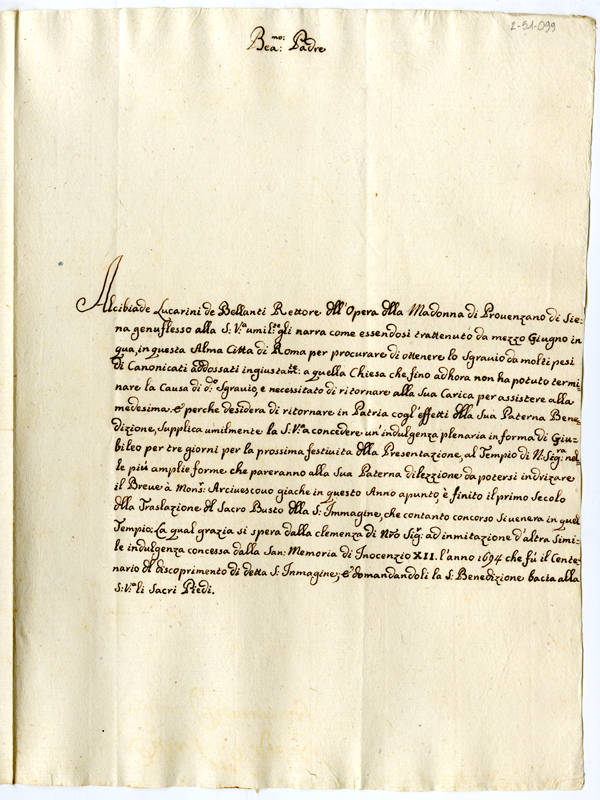 Lettera di Alcibiade Lucarini de Bellanti a papa Clemente XI (1700-1721)