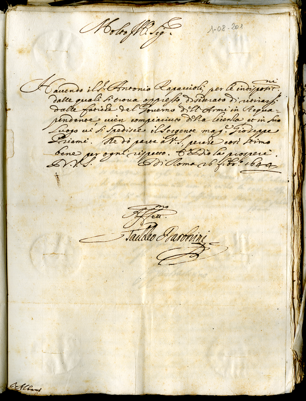 Lettera del signor Barberini Taddeo a Malatesta Albani (1644 febbraio 26)