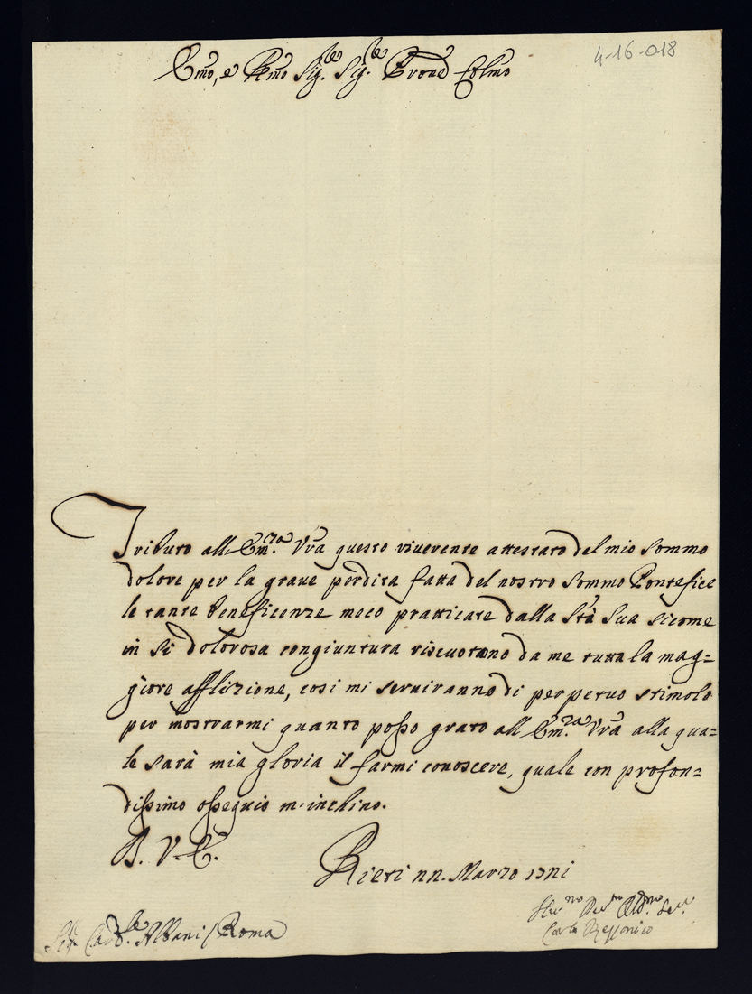 Lettere di condoglianza per la morte di Papa Clemente XI di gloriosa memoria