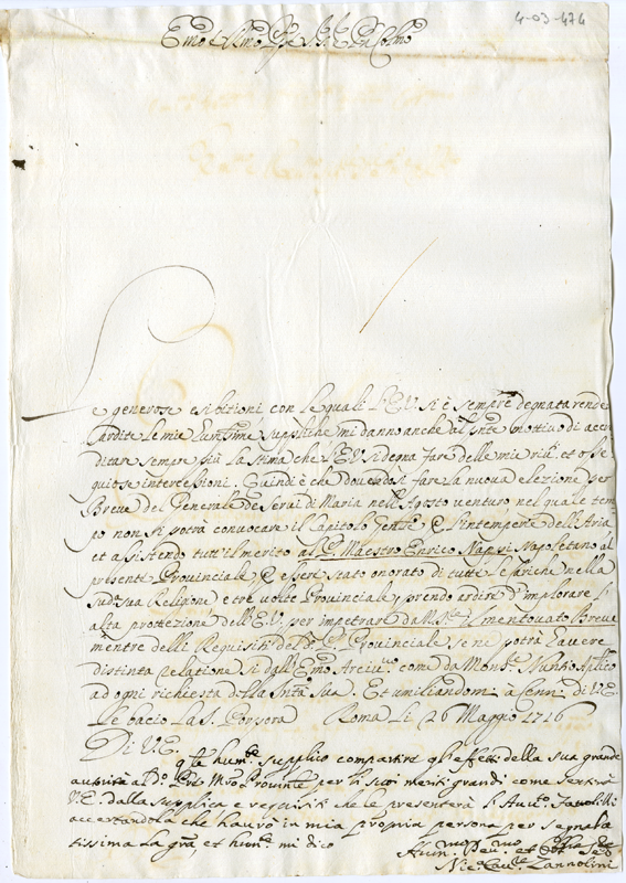 Lettera di Nicola Zannolini al Cardinale Annibale Albani (1716 maggio 26)