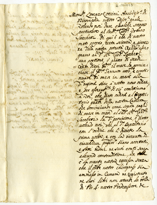 Concessione da parte di papa Clemente XI di una pensione di scudi 110 il mese al cardinale Urbano Sacchetti (1701 gennaio 26)