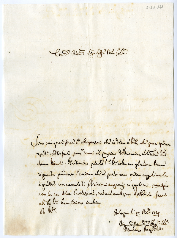 Lettera di Vincenzo Bargelini al cardinale Annibale Albani (1729 dicembre 17)