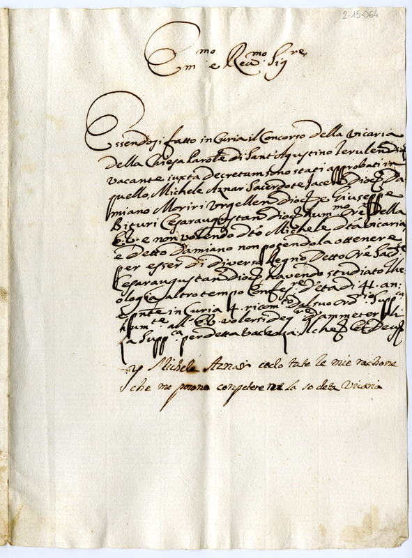 Supplica il cardinale di concedere a lui la vicaria della chiesa parrocchiale di Sant'Agostino di Saragozza, essendo intenzione di Michele Aznar e Damiano Morini di rinunciare