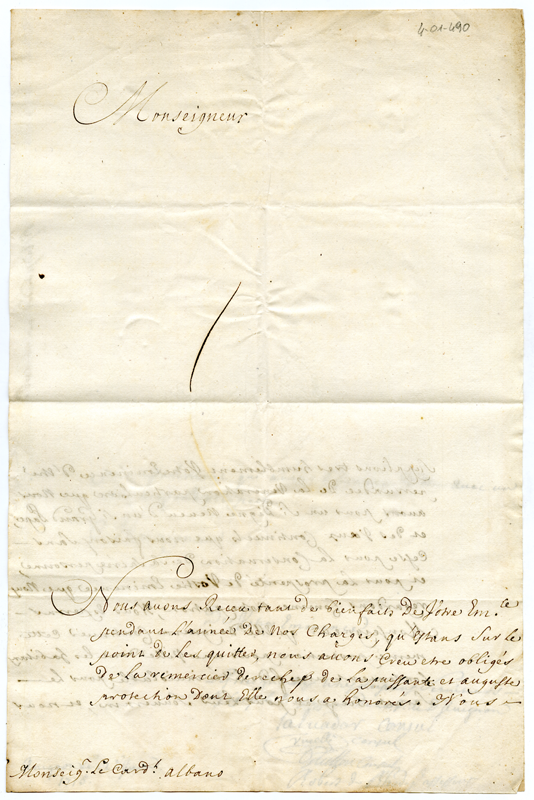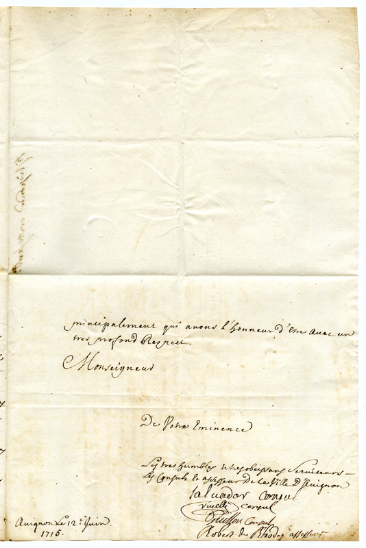 Lettera dei Consoli e Assessore della città di Avignone al Cardinale Annibale Albani (1715 giugno 12)