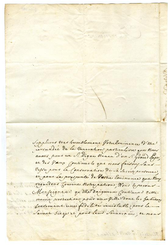 Lettera dei Consoli e Assessore della città di Avignone al Cardinale Annibale Albani (1715 giugno 12)