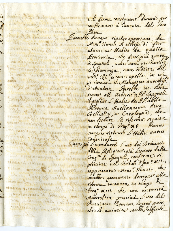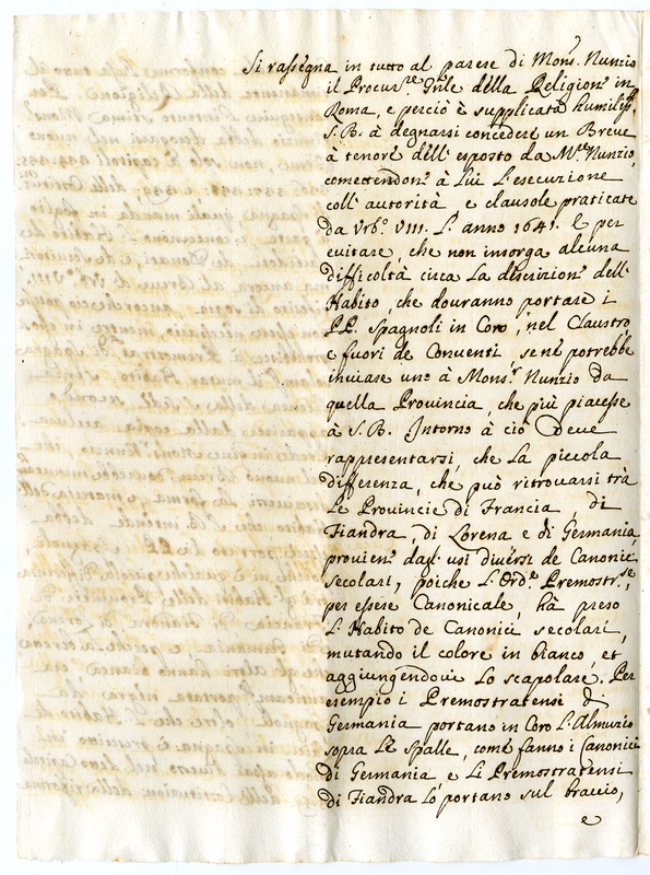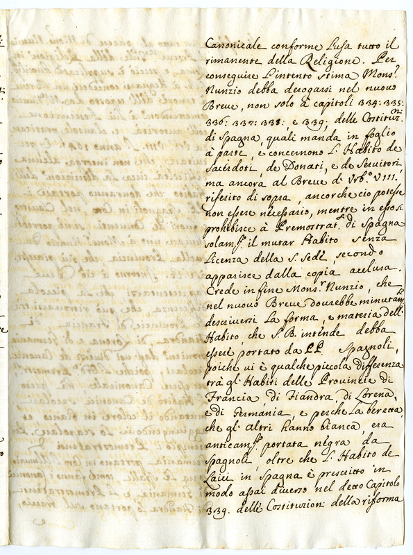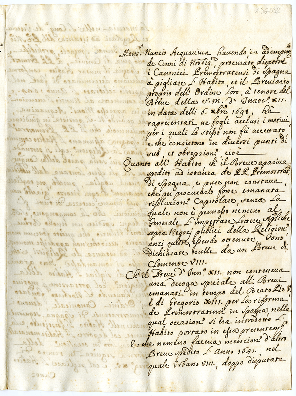 Motivi per i quali non fu accettato l'ordine di Monsignor Nunzio Acquaviva ai Canonici Premonstratensi di Spagna a pigliare l'abito del loro ordine a tenore del breve della Santa Memoria di Innocenzo XII (1700-1721)