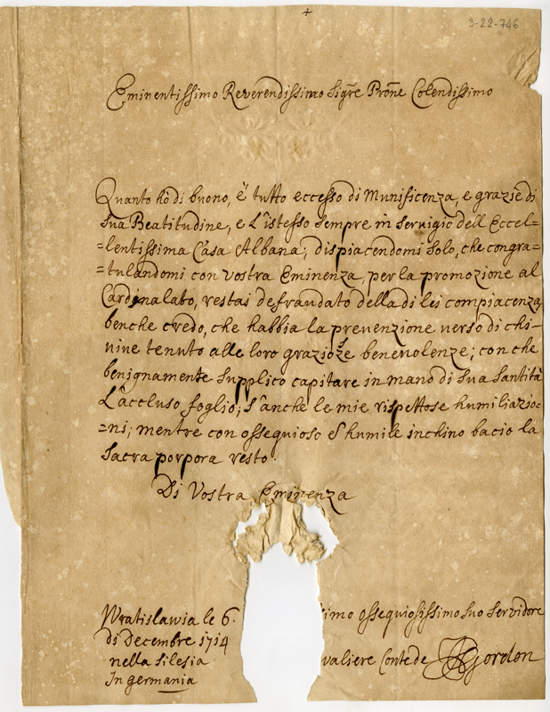 Lettera del cavaliere conte de Gordon al cardinale Annibale Albani (1714 dicembre 6)