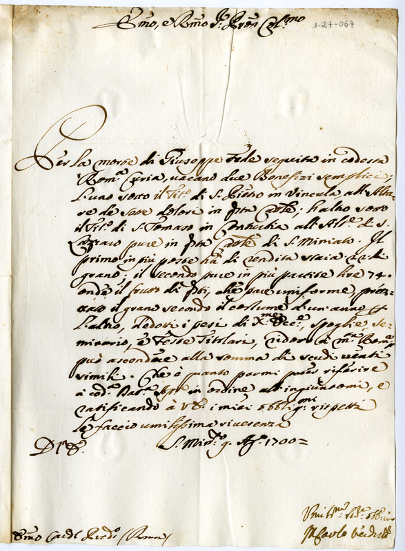 Lettera di Carlo Verdini al Cardinale Prodatario (1700 agosto 9)