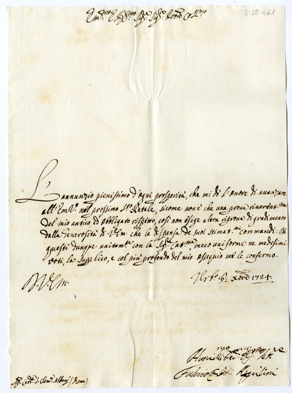 Lettera di Fulvio Corboli Aquilini al cardinale Annibale Albani (1724 dicembre 8)