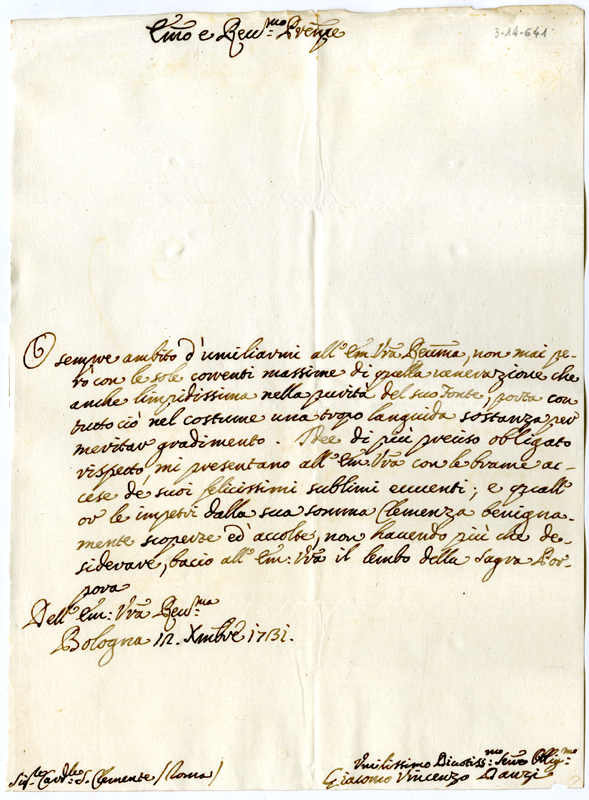 Lettera di Giacomo Vincenzo Danzi al cardinale Annibale Albani (1731 dicembre 12)