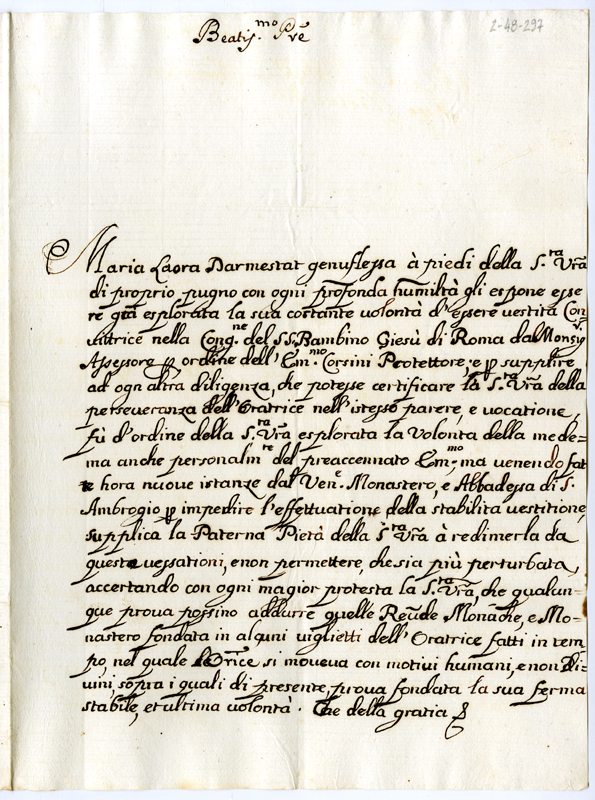 Lettera di Maria Laura Darmestat a papa Clemente XI (1700-1721)
