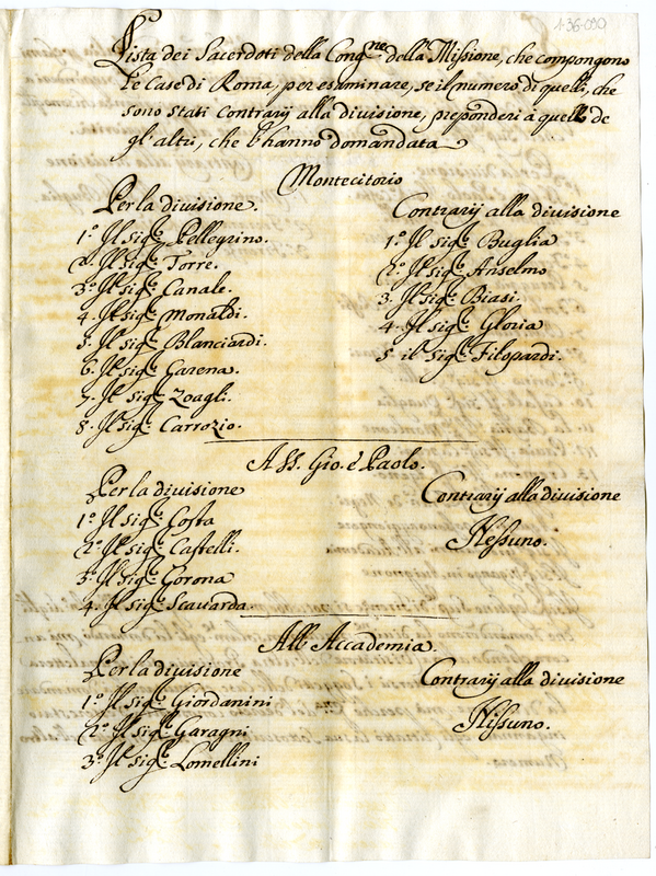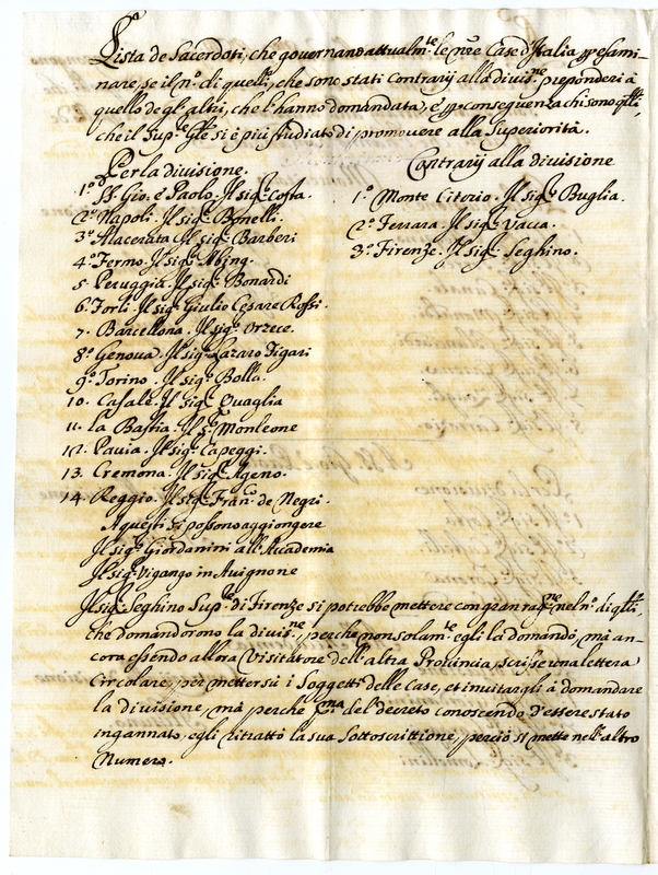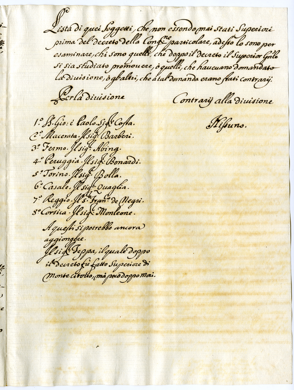 Lista di quei soggetti, che non essendo mai stati Superiori prima del decreto della Congregazione particolare, adesso lo sono per esaminare, chi sono quelli, che doppo il decreto il Superior Generale si sia studiato promuovere, o quelli, che havevano domandato le divisione, o gl'altri, che a tal domanda erano stati contrari (1700-1721)