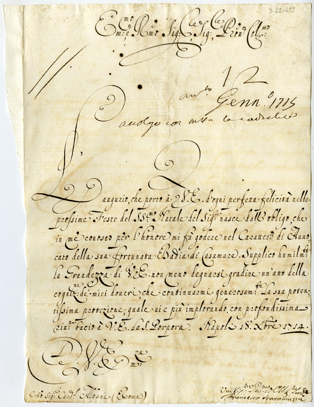 Lettera di Francesco Scaramuzza al cardinale Annibale Albani (1714 dicembre 18)