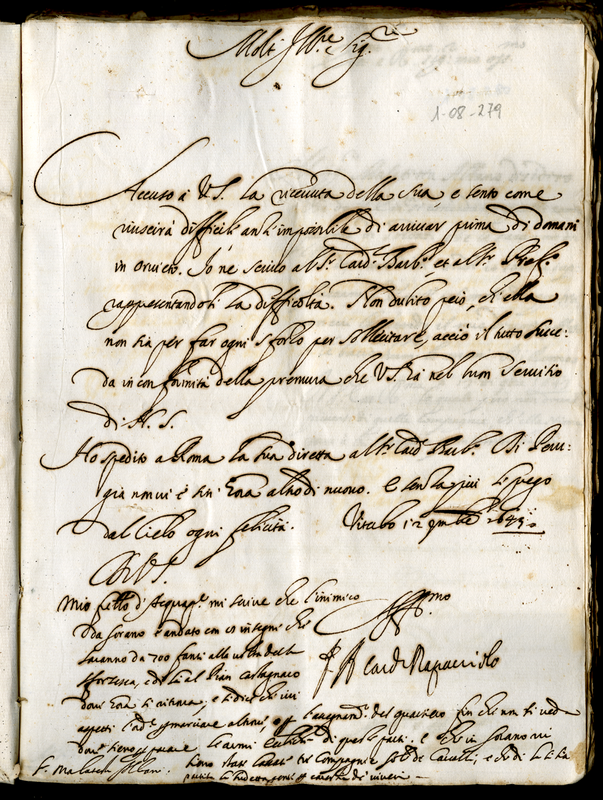 Lettera del Cardinale Rapaccioli Francesco Angelo a Malatesta Albani (1643 novembre 12)