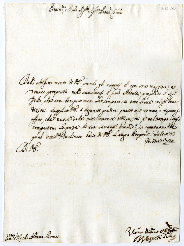 Lettera di Biagio vescovo di Telese al cardinale Annibale Albani (1720 dicembre 13)