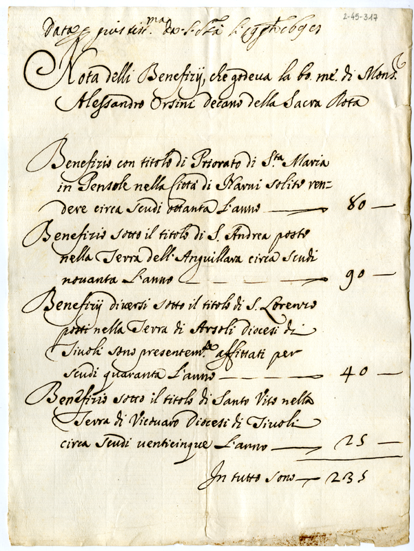 Nota delli Beneficii, che godeva la buona memoria di Monsignor Alessandro Orsini decano della Sacra Rota (1698 novembre 19)
