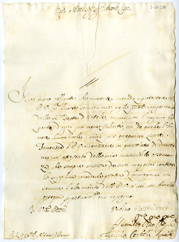Lettera di Fulvio Corboli Aquilini al cardinale Annibale Albani (1715 dicembre 6)