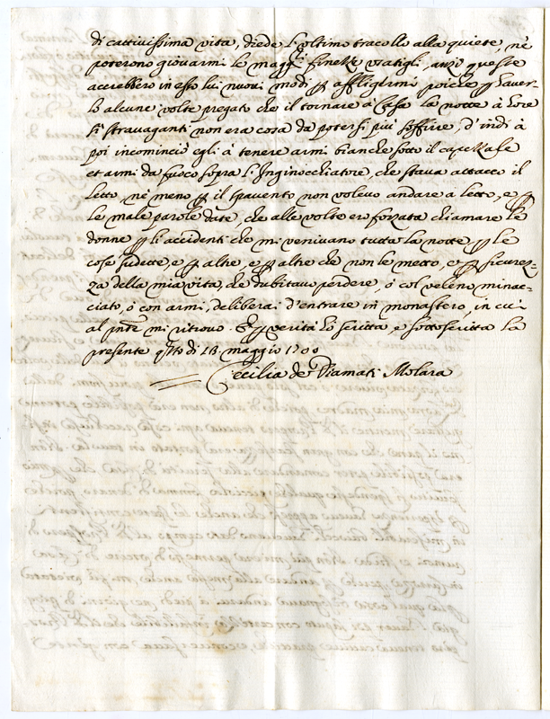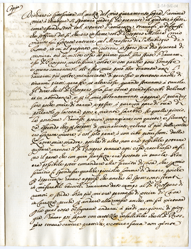 Copia. Dichiarazione di Cecilia de Diamanti Molara sulla forzata entrata nel monastero di Sant'Ambrogio di Roma (1700 maggio 13)