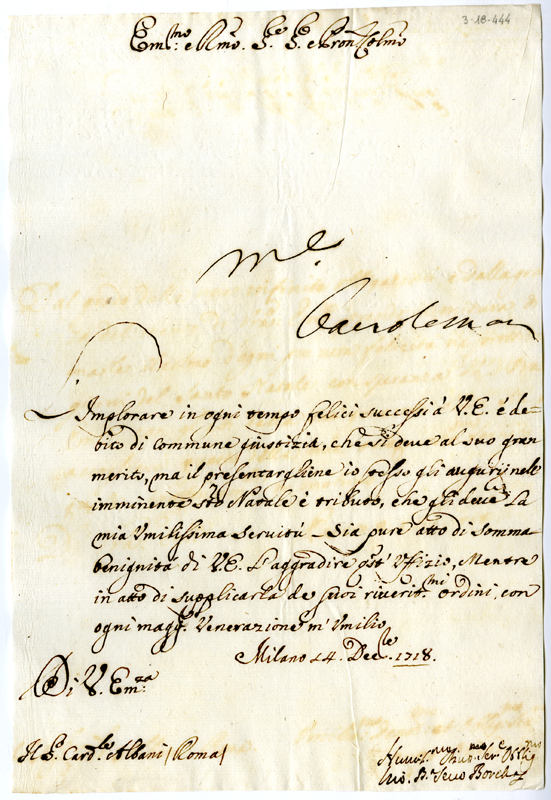 Lettera di Giovanni Battista Borella al cardinale Annibale Albani (1718 dicembre 14)