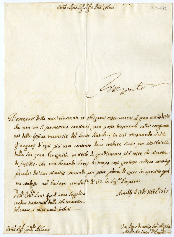 Lettera di Michele arcivescovo di Amalfi al cardinale Annibale Albani (1717 dicembre 18)
