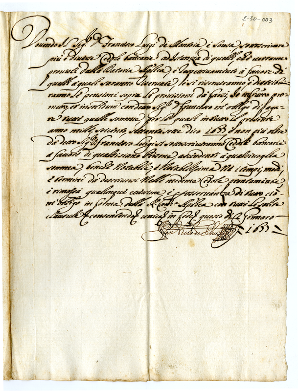 Dichierazione "in solidum" di pagamento di tutte le somme sottoscritte attraverso cedole bancarie dal signor Francesco Luigi de Montoia per l'anno 1677 e non olttre
