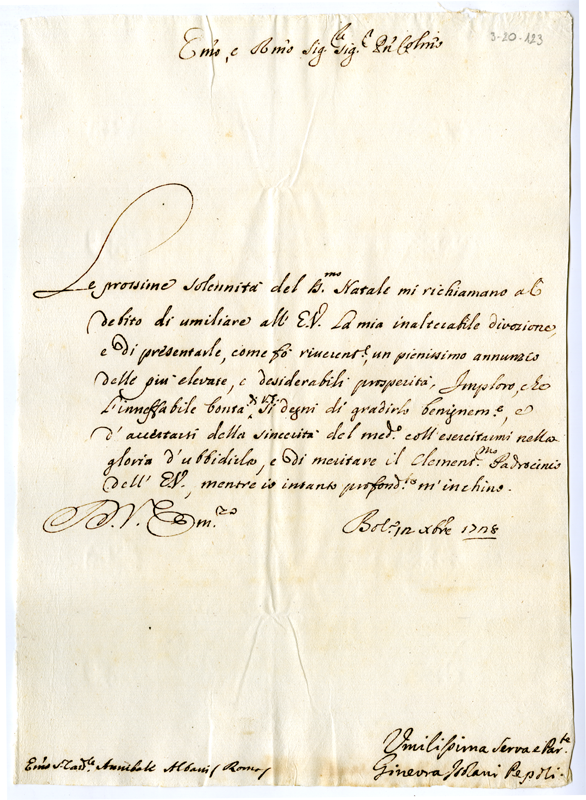 Lettera di Ginevra Isolani Pepoli al cardinale Annibale Albani (1728 dicembre 12)
