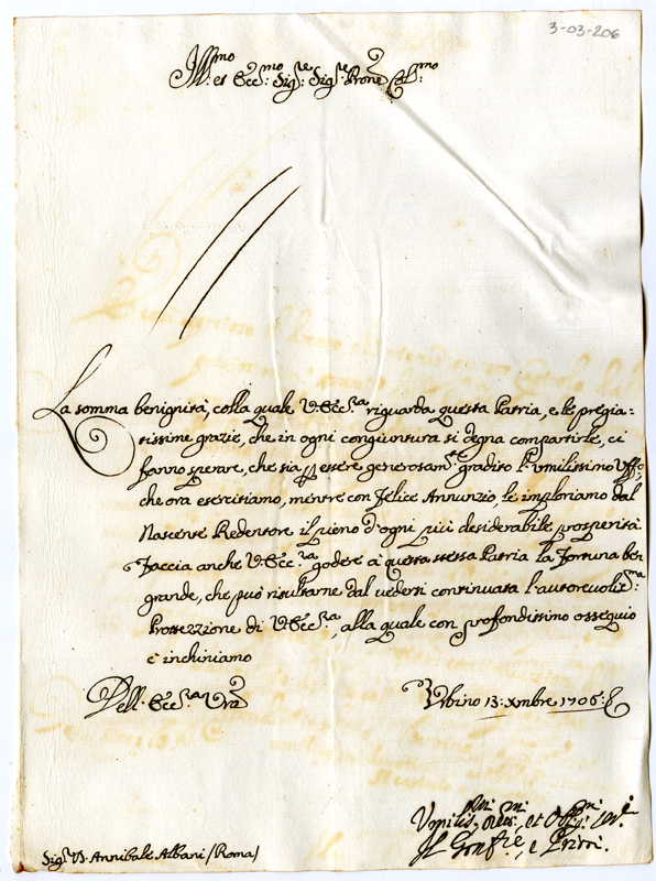 Lettera del confaloniere e priori di Urbino ad Annibale Albani (1706 dicembre 13)